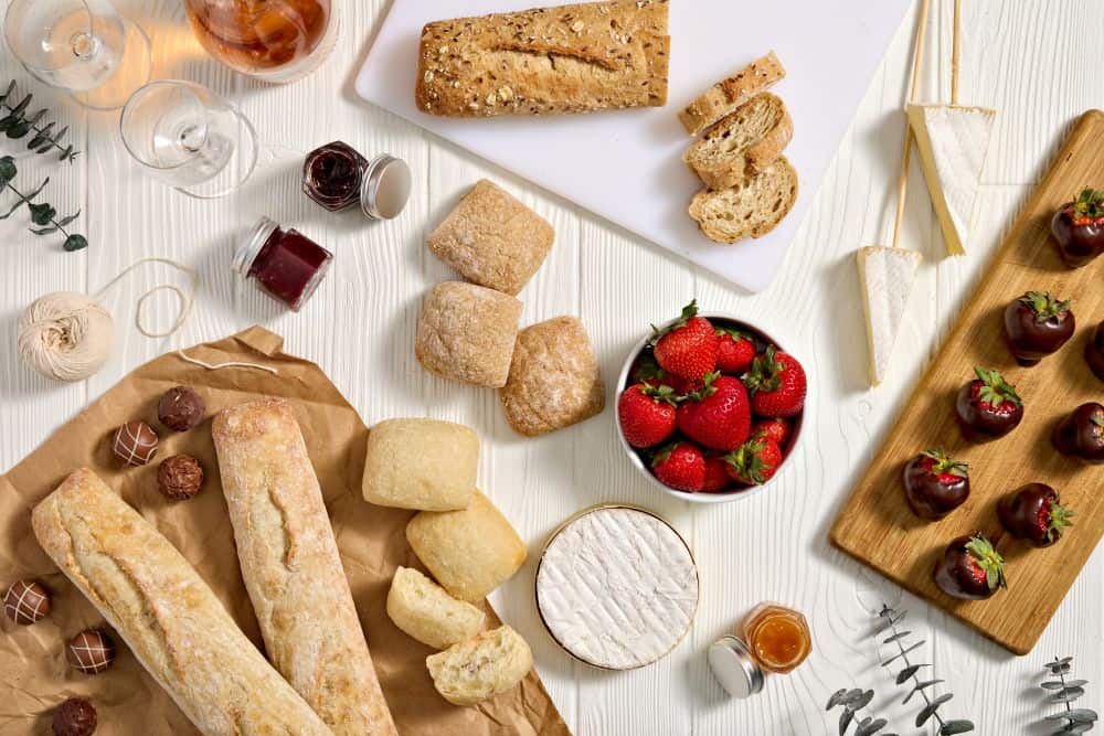 Flowers and chocolate may be Valentine’s Day or anniversary classics, but why not surprise your sweetheart with a romantic artisan bread bouquet that doubles as a picnic for two? Start with Tribeca Oven Ciabatta, with its pillowy interior and crisp crust—just right for sharing. Then, weave in these decadent accompaniments: