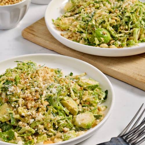 For instance, a classic Caesar salad gets a modern update when romaine is swapped out with shredded brussels sprouts tossed in housemade dressing and topped with garlic breadcrumbs. The savory, crisp topping offsets the raw crunch of the brussels with a warm, toasty flavor, making for a texture-rich dish that maximizes ingredient usage without complex prep.